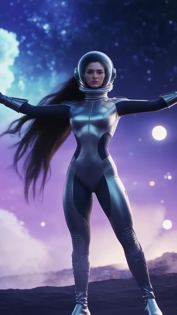 AI Generated Image. Female astronaut standing on alien planet, raising arms toward glowing orb and swirling nebula backdrop. Suit reflecting purple-blue light, helmet visor framing focused face, long hair flowing behind. Frame capturing confident power pose with arms outstretched, conveying empowerment, wonder, and discovery. Featuring high-contrast purple-blue palette, soft bokeh stars, distant planets, cinematic shallow depth of field, and dramatic rim lighting. Vertical video format offering tall aspect ratio and cinematic composition, working well for mobile-first content and social vertical placements. Suggested uses: sci-fi trailers, tech and space documentaries, empowerment campaigns, hero journey narratives, social media reels, app intros, advertising for STEM programs, educational content, recruitment materials, book covers, posters, motion graphics backgrounds, and title cards. Providing room for lower-third titles, call-to-action overlays, and animated text. Working well for 15-60 second vertical reels, hero headers, and promos. Enhancing brand storytelling, highlighting female leadership in STEM, and supporting themes of exploration and discovery.