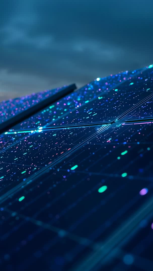 AI Generated Video. Vertical video showing low-angle tilt across photovoltaic panel array at dusk, featuring pulsing multicolor particles and glowing traces representing energy flow. Camera starting low and moving along panel surface while focus shifting to create shallow depth of field and cinematic bokeh. Deep blue dusk tones with neon cyan and magenta highlights creating futuristic clean energy mood. Working well for renewable energy marketing, technology presentations, investor pitches, social media reels, mobile wallpapers, website hero clips, explainer videos about smart grid and solar power. Allowing editors to loop, speed ramp, or add text overlays for dynamic intros, title sequences, background visuals for sustainability campaigns, or visual metaphors for data flow and electricity.