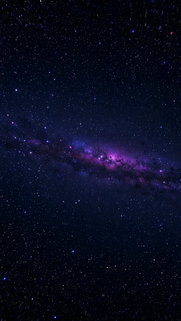 AI Generated Video. Vertical video showing Milky Way band shifting across purple nebula after slight camera move, creating subtle parallax and star motion. Deep indigo and violet palette giving cinematic cosmic atmosphere. Footage capturing dense star field and dusty galactic core with gentle camera pan, suitable for vertical screens and mobile-first platforms. Use for astronomy documentary intros, science education clips, planetarium and observatory promotions, music video backgrounds, meditation and sleep apps, social media reels and vertical ads, website hero banners and mobile wallpapers. Clip supporting text overlays, title sequences, slow ambient soundtracks, and loopable backgrounds for creative projects.