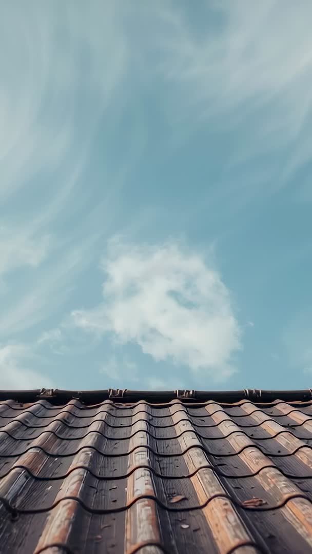 AI Generated Image. Vertical 9:16 clip filmed from low angle, panning up across weathered curved clay tiles toward drifting cloud in blue sky. Clip capturing rich rooftop texture, repeating tile pattern, rustic color tones and subtle ridge silhouette. Use for architecture and roofing projects, home renovation promos, travel and lifestyle reels, social media stories and vertical ads, website hero backgrounds and editorial overlays. Suitable for mood-driven content, nostalgic branding, environmental storytelling, roof repair tutorials, texture packs and design mockups. Color palette featuring warm terracotta, muted brown and soft sky blue, mood calm and timeless. Include loop, slow motion, text overlay or parallax effect to enhance usage.