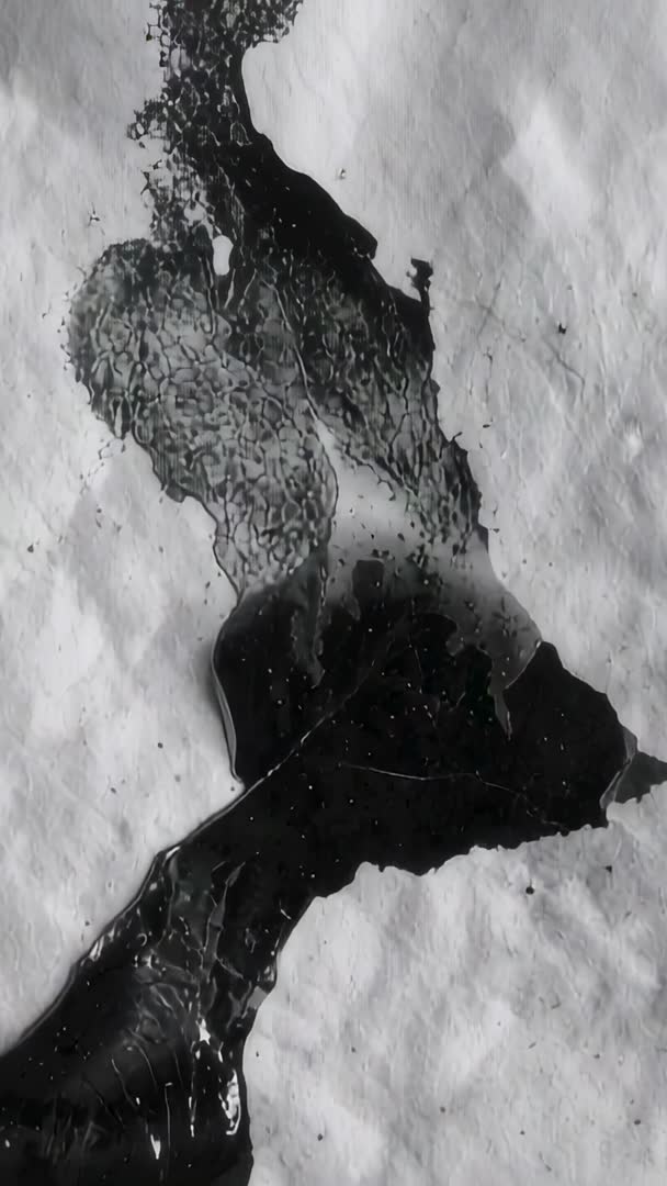 AI Generated Video. Video showing black ink flowing and spreading across crumpled paper while droplets scattering and marbling patterns forming. High contrast monochrome palette emphasizing fluid texture and surface tension details. Vertical orientation suiting mobile storytelling and social vertical formats. Clip working well as loopable background for lab and science themed presentations, documentary sequences, design portfolios, commercial promos. Creative uses including overlaying text and logos, creating texture packs, producing title intros, illustrating viscosity and fluid dynamics in educational materials, enhancing abstract art projects. Macro perspective highlighting droplet detail and surface ripple patterns, enabling slow motion or speed ramp edits. Ideal for designers, filmmakers, educators, and social media creators seeking moody, tactile visual element.