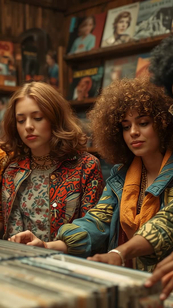 AI Generated Image. Opening vertical shot showing two friends reaching into record bin, browsing vinyl in retro record shop. Using warm film tones and patterned wardrobe suggesting 1970s inspired style. Composing frame to emphasize hands, facial expressions, rows of records in foreground and shelves in background. Conveying nostalgia, companionship, analog music culture, crate-digging discovery. Serving music store promotions, vinyl resurgence stories, lifestyle content, social media reels, b-roll for documentaries, retail marketing. Suggesting use as intro for short film about music discovery, overlaying text for event promotion, or cutaway for editorial on indie businesses. Recommending adding ambient shop sound and vinyl crackle for authentic audio. Offering vertical format optimized for mobile platforms, ready for trimming to shorter clips or combining into montage.