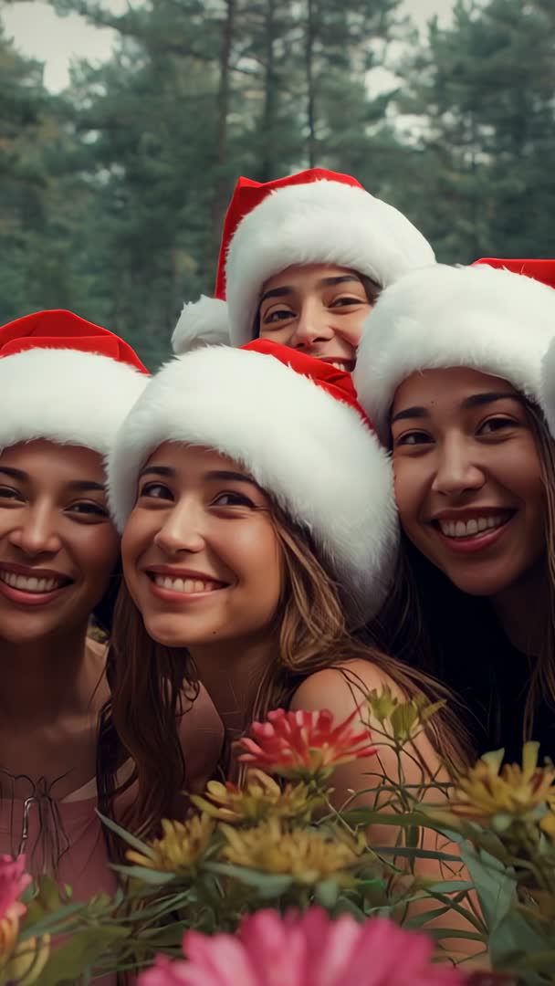 AI Generated Image. Featuring group of friends wearing Santa hats, posing and smiling among conifer trees and pink blooms. Close-up vertical framing creating intimate holiday mood with warm natural light and candid expressions. Suitable for holiday greetings, social media reels, seasonal ads, greeting card animation, event promotion, retail campaign hero clips and influencer content. Editing suggestions: apply gentle vertical pan or slow zoom, add festive music and animated text or snow overlays, color grade toward warmer tones for cozy feel. Composition working well for portrait-oriented storytelling, lifestyle marketing and seasonal branding.