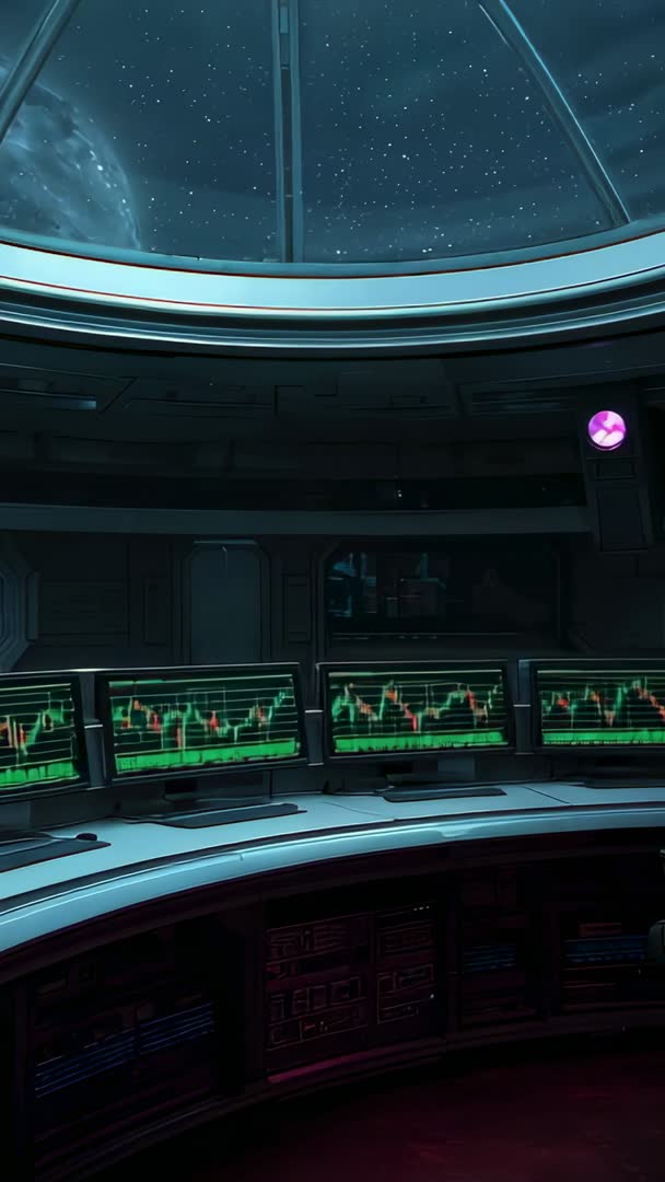 AI Generated Image. Vertical video showing futuristic spaceship bridge interior with curved console and row of monitors displaying fluctuating green graphs while starfield pulses through overhead viewport. Footage conveying high-tech operations, real-time analytics, and interstellar mission control atmosphere. Suitting use in sci-fi trailer openers, tech product launch visuals, financial news and trading stream backgrounds, app and UI demo reels, game cinematic intros, and immersive VR experiences. Clip working well as loopable background for vertical social ads, stream overlays, motion design projects, and broadcast lower third animations; pairing with voiceover, data-driven motion graphics, or cinematic score to enhance dramatic impact.