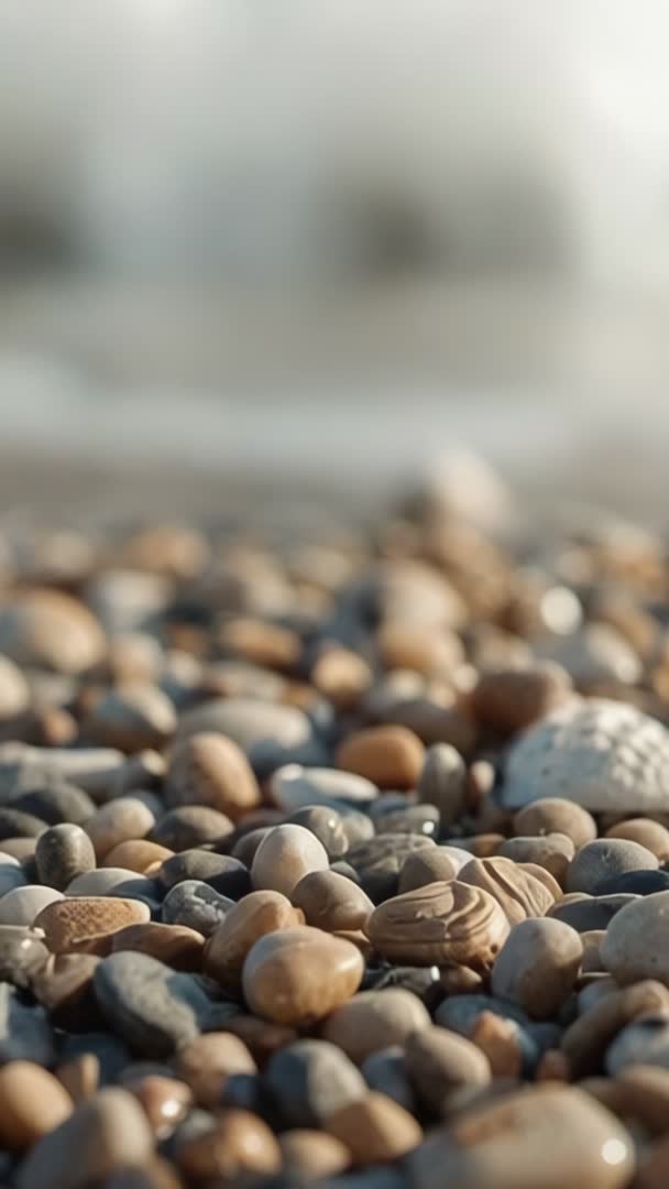 AI Generated Video. Showing close-up foreground pebbles and seashell while gentle waves lap shoreline and sea foam forms, vertical clip captures calm coastal mood. Focusing on textures and soft bokeh, footage works well for mobile stories, social reels, and portrait banners. Use as calming background for meditation apps, wellness promos, travel ads, hotel websites, or product showcases for beachwear and skincare. Looping short clip creates seamless ambient video for waiting rooms, spa displays, and retail screens. Color palette of warm neutrals and muted blues supporting minimalist design and overlay text. Recommend gentle slow-paced soundtrack and subtle sound of waves for final edit.