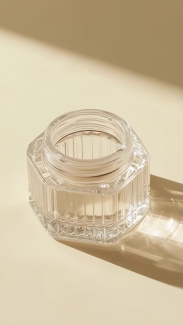 AI Generated Image. Showing empty faceted glass jar catching warm sunlight and casting long geometric shadows across cream tabletop. Camera framing vertical for mobile-first composition, highlighting transparency, refraction, and light patterns. Soft natural light creating crisp inner reflections and elongated shadow bands. Serving social media vertical ads, Instagram Stories, Reels, TikTok content, mobile landing pages, product branding, cosmetic packaging mockups, editorial hero clips, mood backgrounds for minimalist design. Providing clean negative space for overlay text, logos, motion graphics or subtle product reveal. Helping beauty, home decor, lifestyle, luxury brands convey premium minimal aesthetic through texture, light, and composition.