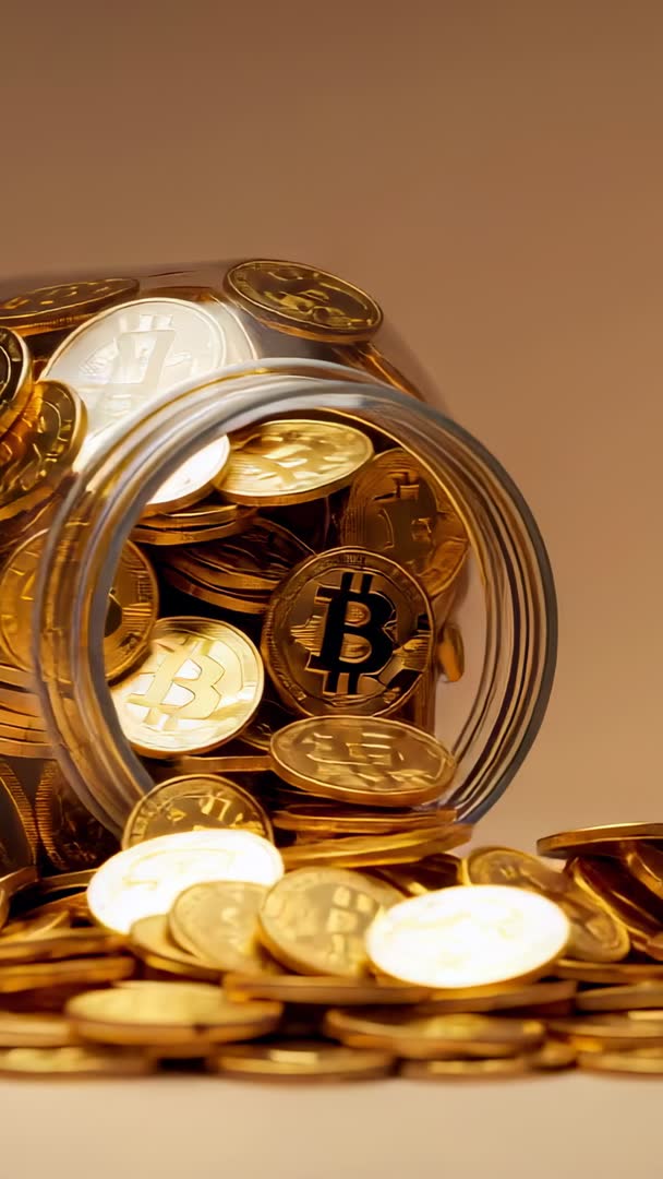 - Vertical video: Glass jar spilling gold Bitcoin coins on warm-lit tabletop