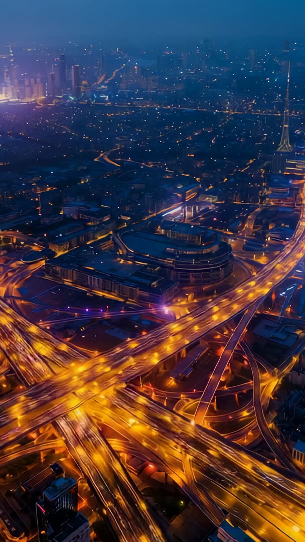 AI Generated Video. Vertical video showing camera gliding over illuminated urban interchange at night, highlighting layered ramps, glowing light trails, and distant skyline. Camera movement starting low then ascending to reveal dense city grid and high-rise silhouettes. Warm amber road lights contrasting with cool blue skyline creating cinematic neon palette. Footage suiting transport infrastructure projects, urban planning presentations, city branding, news openers, architecture documentaries, tech commercials, social media vertical ads, and mobile-first hero backgrounds. Offering loop-friendly motion, strong light trails for time-lapse feel, and room for color grading or title overlays. Recommend using slow motion or speed ramping to emphasize traffic flow, adding ambient electronic soundtrack for modern vibe, and placing titles or lower-thirds within safe zones for clear on-screen text.