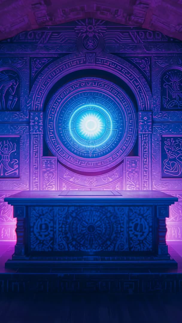 AI Generated Image. Vertical ritual video showing glowing blue energy disc pulsing then fading above ornate ancient stone altar inside carved chamber. Neon blue and magenta lighting creating atmospheric contrast and deep shadows. Composition suiting mobile vertical formats such as reels and stories, loopable for background or title treatments. Use cases including spiritual app intros, fantasy or sci-fi trailers, game cutscenes, meditation timers, mystery or occult promos, museum or exhibition displays, streaming thumbnails, and AR experiences. Footage working well with ambient electronic or orchestral soundtrack, sound design emphasizing low pulses and crystalline chimes. Graphics and VFX teams using footage for compositing with text overlays, title cards, particle effects, or seamless looping backgrounds.