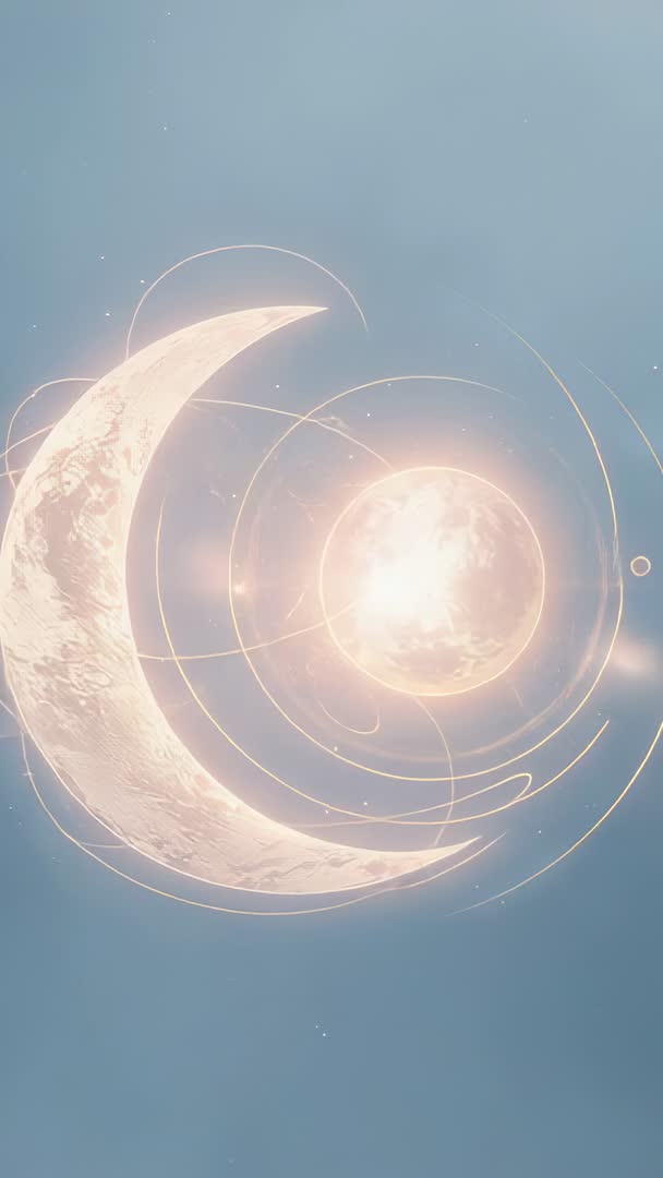 AI Generated Video. Scene showing glowing crescent moon cradling pulsing sunlike orb, orbiting light rings tracing soft circular paths, delicate filaments sparking and creating halo effects against pastel blue sky. Visual offering slow, hypnotic motion with gentle bloom and warm gold highlights contrasting cool background, producing ethereal, meditative atmosphere. Serving as vertical background for social stories, mobile wallpapers, app intros, meditation and wellness videos, music visualizers, title sequences, sci-fi and fantasy promos. Looping friendly for seamless playback, working well with soft ambient music or subtle sound design. Applying slight color grade to enhance gold tones, adding subtle grain for cinematic feel, exporting at 9:16 aspect ratio 1080x1920 or 2160x3840 for 4K vertical. Serving well in advertising, streaming content, creative campaigns, seasonal greetings, branding animations, and UI backgrounds.