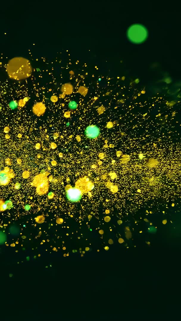 Vertical video glowing gold and green particle cloud streaming across dark void with bokeh Video