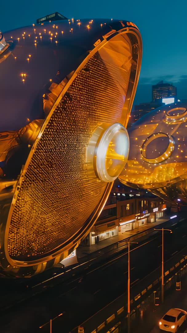 AI Generated Video. Vertical footage capturing giant industrial reflector bulb glowing over urban street at dusk. Warm golden light reflecting off polished metal surface and emitting ember-like spark patterns across curved reflector. City traffic moving below with streaking headlights adding dynamic motion contrast. Close-up framing highlighting textured interior and circular geometry, creating abstract futuristic composition. Mood blending industrial technology and everyday urban infrastructure at night. Suitable for technology commercials, lighting design portfolios, smart city presentations, urban lifestyle campaigns, music video B-roll, cinematic openers, social media vertical ads, website hero sections, and broadcast lower thirds. Recommended editing techniques: slow motion and subtle zoom for dramatic effect, color grade emphasizing warm gold tones, add light leak overlays for enhanced spark effect, loop clip for continuous background use. Available in vertical 9:16 aspect for mobile-first content.