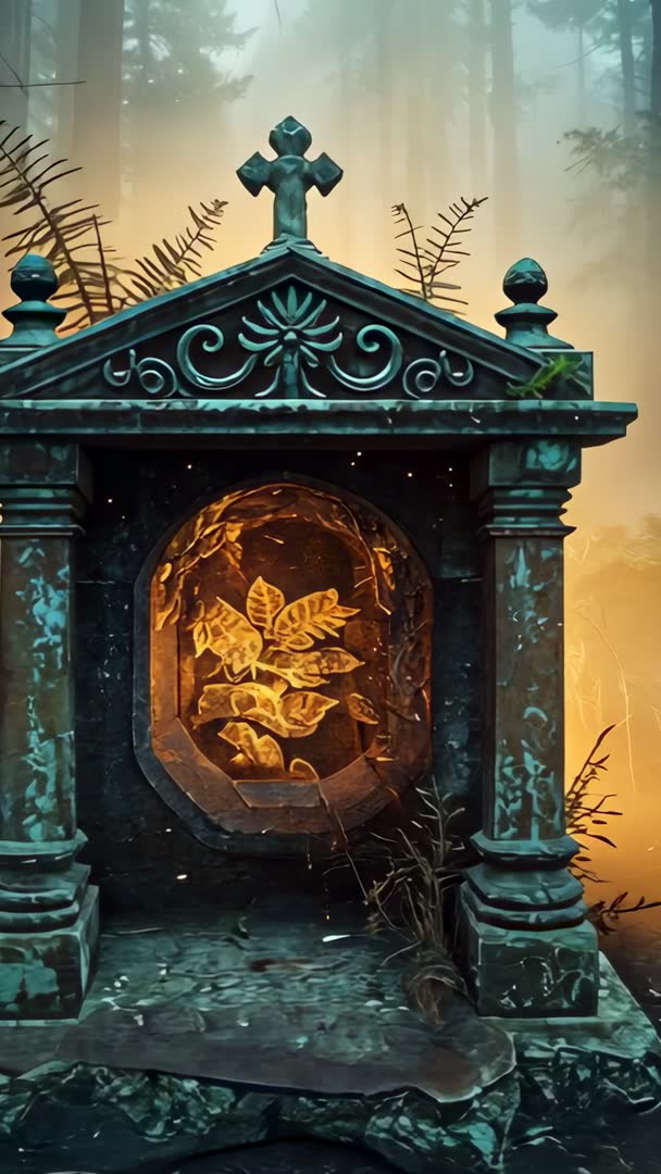 AI Generated Image. Video showing vertical composition of glowing stone shrine nestled in misty conifer forest, warm backlight rising behind tall trees, ornate mausoleum entrance framing carved leaf relief glowing with amber light. Camera performing slow push-in, revealing textured moss, cracked stone, swirling fog and drifting dust motes. Mood evoking mystery, reverence, and quiet wonder. Use ideas: Use for mobile reels and stories, horror or fantasy project openers, spiritual and meditation background loops, travel and heritage documentary transitions, game cinematic concept art, book trailer title sequences. Technical tips: Crop and loop friendly for vertical platforms, boost teal-green patina and deepen warm amber highlights for cinematic contrast, add low ambient drone with soft metallic chime and distant wind for immersive sound design. Licensing note: Ideal for atmospheric, mysterious, spiritual, and fantasy themes.