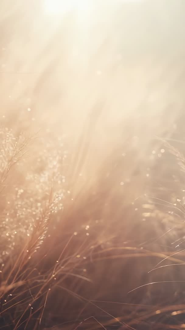 AI Generated Video. Featuring golden backlit meadow grass swaying in gentle breeze, dew droplets sparkling across seed heads and soft bokeh creating warm, dreamy atmosphere. Slow, cinematic motion and shallow depth of field placing emphasis on delicate textures, while background melting into soft light. Presenting warm golden tones and high-key backlight, making clip ideal for creating tranquil, uplifting visual moments. Perfect for using as vertical background clip on mobile apps, social media stories, Instagram Reels and TikTok, as well as hero banners for websites and digital ads. Supporting wellness and meditation content, travel and nature promos, seasonal marketing, and natural product campaigns by providing calm, organic backdrop for overlay text and logos. Making seamless loops and pairing with ambient music recommended for mood-driven projects and title screens.