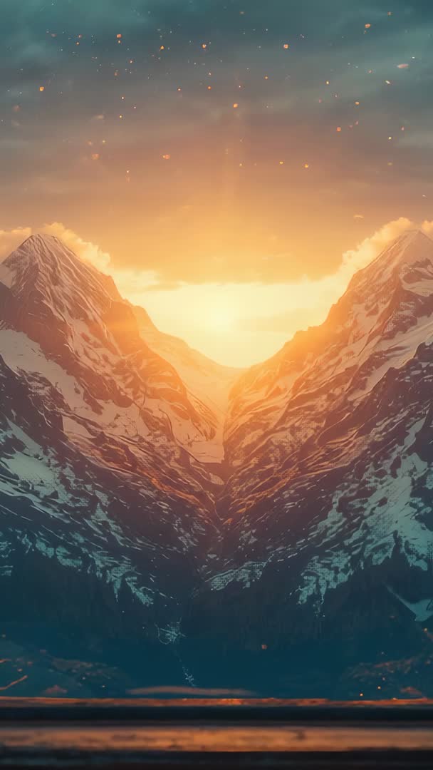 AI Generated Image. Vertical cinematic clip showing golden sun glowing between twin mountain peaks in V-shaped alpine valley. Low sun casting warm light across snow-capped slopes while drifting sparks float through sky. Symmetrical composition creating dramatic central valley leading to bright horizon and subtle water reflection. Color palette blending warm golds with cool teal shadows, creating cinematic contrast and depth. Mood conveying serenity, wonder, majestic scale. Usage suggestions: Using as vertical background for smartphone screens, social media reels, and stories. Serving as atmospheric opener for travel and adventure films, meditation and wellness app backgrounds, brand hero banners for outdoor gear, and inspirational quote overlays. Ideal for looped ambient playback in lobbies, events, and virtual backgrounds. Suitable for color grading, slow-motion editing, text and logo overlays, and cinematic title sequences.