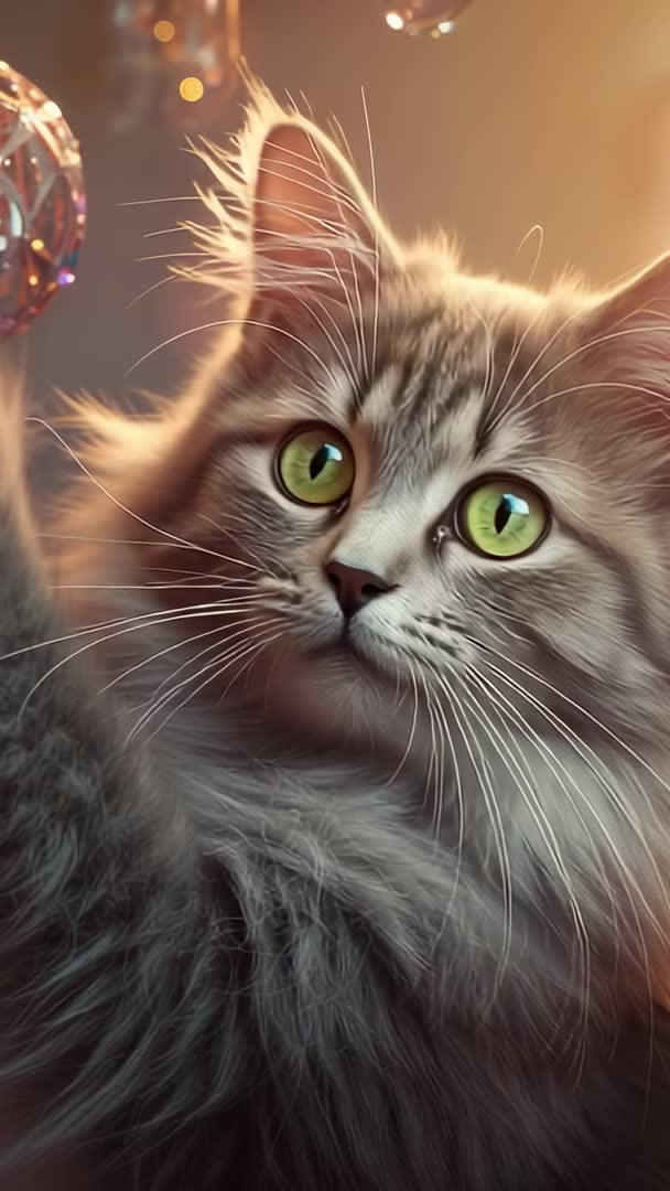 AI Generated Image. Showcasing gray tabby cat up close, tilting head while reacting to sunbeams and hanging crystal sparkles. Capturing vivid green eyes, delicate whiskers, and soft long fur with shallow depth of field and warm rim light. Working well for pet brand ads, social media reels, calming content, interior decor websites, and holiday campaigns. Suggesting using as loopable clip for Instagram Stories, TikTok, and YouTube Shorts, adding soft ambient music or gentle voiceover for emotional connection. Offering space for text overlays or logo on left side and easy color grading for warm or cool mood. Serving well for stock libraries, editorial pet features, lifestyle videos, and product marketing for cat toys, grooming, or home accessories.
