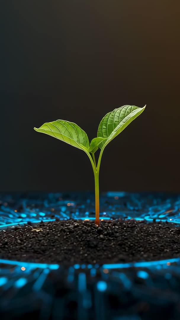 AI Generated Video. Video showing single green seedling growing from rich dark soil while blue glowing ring pulsing beneath, causing gentle stem and leaf motion. Background fading to soft dark gradient, studio lighting highlighting leaf texture and veins. Visual blending nature and technology, portraying growth, innovation, sustainability. Working well for eco technology campaigns, startup branding, renewable energy presentations, biotech explainer videos, mobile vertical ads, social media reels, website hero banners, product launches. Edit-friendly composition allowing text overlay on upper negative space, easy color grading for brand matching, loopable clip for ambient backgrounds. Licensing fitting for marketing use, editorial features, corporate sustainability reports, educational content.