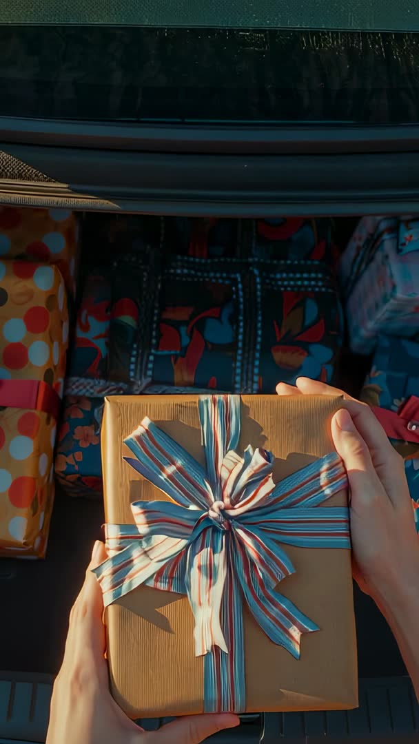 AI Generated Image. Footage showing hands adjusting brown kraft paper gift box tied with blue-red striped ribbon inside car trunk during daylight. Top-down close-up composition capturing tactile details of ribbon texture and wrapping folds, shallow depth of field separating foreground box from stacked gifts in background. Lighting offering warm highlights and soft shadows, natural skin tones, casual wardrobe visible at edges. Suitable for seasonal gifting, party preparation, road trip packing, ecommerce product showcase, social media reels, blog or newsletter headers. Use for marketing campaigns promoting gift wrapping services, subscription boxes, holiday sales, family travel stories, automotive lifestyle content. Suggested edits include adding upbeat music, quick cut transitions, overlay text for call-to-action, color grading to boost contrast and saturation for festive look.