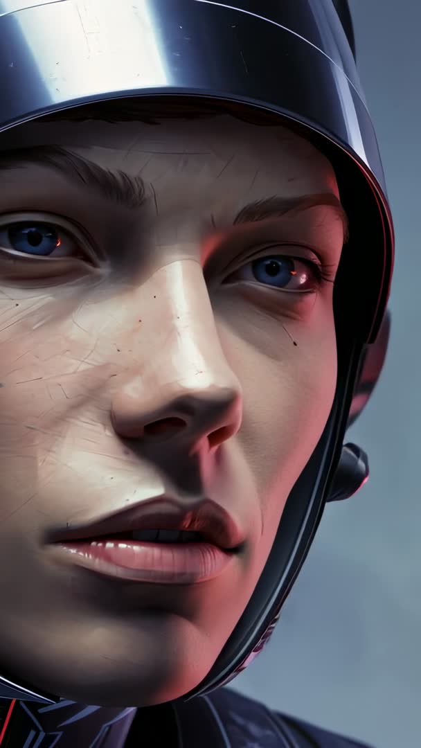 AI Generated Video. Vertical clip showing helmeted woman turning forward while camera is shifting, revealing integrated headset and microphone. Metallic helmet reflecting studio lights, skin detail showing fine scratches and realistic texture. Lighting mixing cool blue tones with warm rim light, creating cinematic and tense atmosphere. Ideal for tech promos, sci-fi trailers, pilot recruitment, training modules, UI backgrounds, and game cinematics. Ready for titles and lower thirds, motion graphics friendly and optimized for mobile-first vertical platforms.
