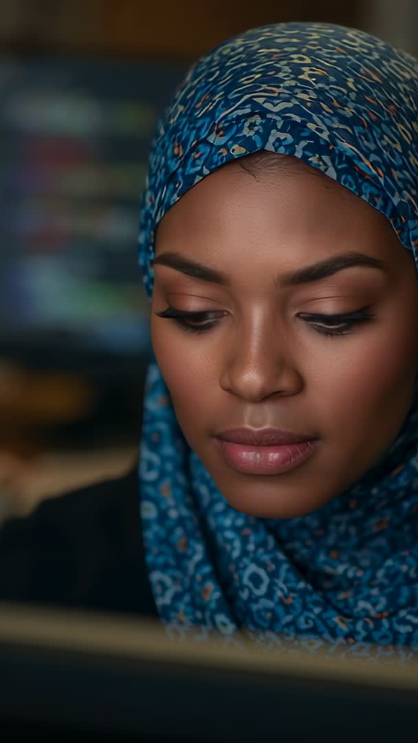AI Generated Image. Vertical clip showing hijab-wearing student reading laptop screen and studying notes with calm concentration. Closeup framing highlighting facial expression, long eyelashes, and patterned blue headscarf. Soft warm lighting creating intimate, focused mood optimized for mobile vertical playback. Serving well for education websites, e-learning campaigns, online course promos, social media stories and vertical ads, study app promotion, library outreach, diversity and inclusion content, and student lifestyle features. Suggesting editorial treatments like overlay text, call-to-action buttons, split-screen sequences with screen content, or captioned tutorial segments.