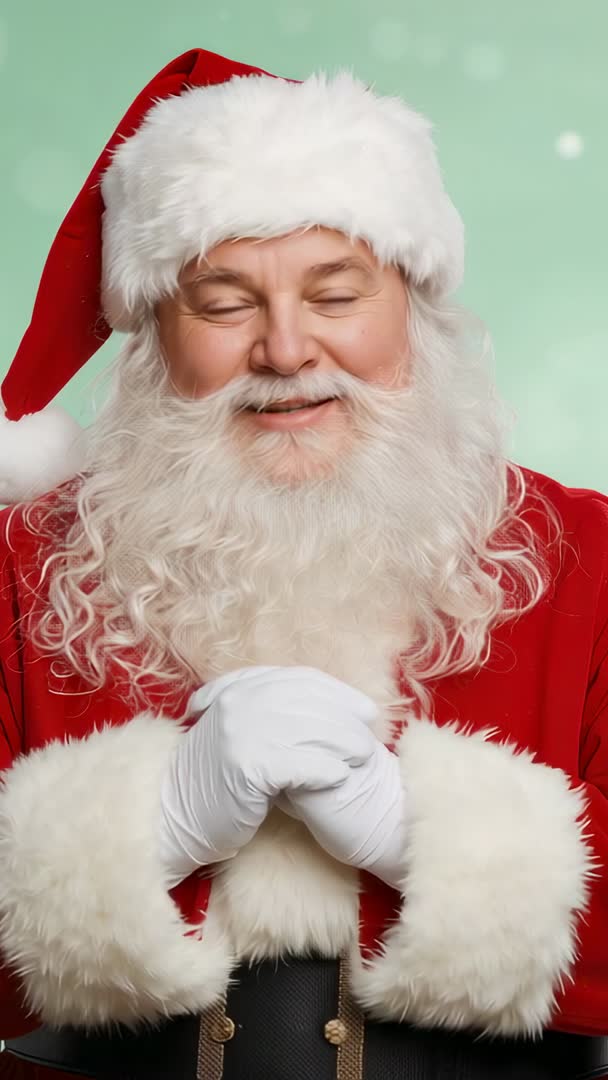 - Vertical video: Jolly Santa Claus smiling, briefly closing eyes, hands clasped