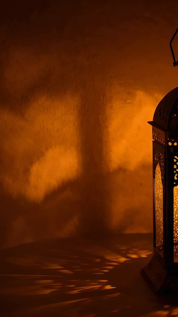 - Vertical video lantern casting flickering amber glow and ornate shadow patterns