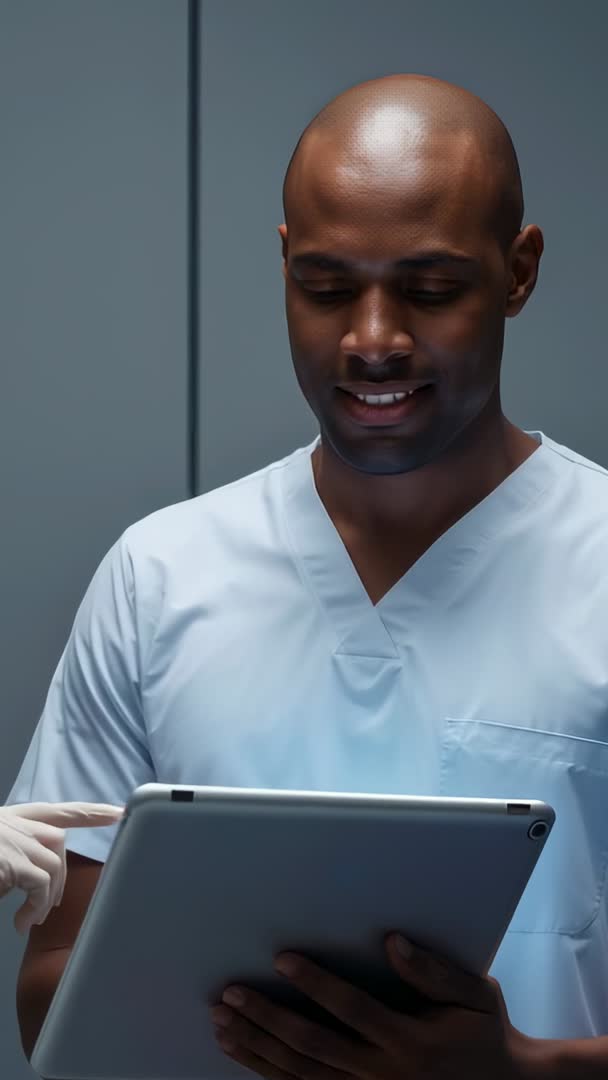 AI Generated Video. Vertical portrait video showing male clinician in blue scrubs reviewing tablet while gloved colleague pointing at screen. Soft clinical lighting creating calm, focused mood. Close-up composition highlighting facial expression, tablet interaction, and teamwork between clinicians. Footage conveying modern digital health workflow, telemedicine consultation, EMR review, and diagnostic collaboration. Useful for healthcare websites, hospital marketing, medical training modules, clinical technology demos, electronic health record tutorials, and social media campaigns. Clips supporting editorial pieces about digital transformation in healthcare, staff training, patient communication, and teamwork. Color grading and vertical framing optimizing content for mobile-first platforms and short-form video channels.