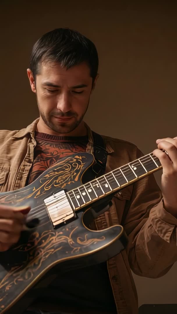 AI Generated Video. Video showing man practicing on ornate hollowbody electric guitar, focusing on fretboard and finger technique. Warm tonal lighting highlighting wood grain and decorative inlay on guitar body. Composition keeping hands and instrument in frame while head-down expression conveying concentration and musical focus. Suitable for music lesson clips, instrument reviews, guitar brand promotion, social media reels, vertical ad campaigns, tutorial series, blog posts about practice routine, streaming thumbnails. Ideal for editing into short-form content, background b-roll for interview about musicianship, or promotional material for music schools and instrument shops. Offering natural, cinematic color and intimate perspective for connecting with audience.