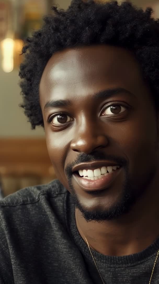 AI Generated Image. Vertical 9:16 video capturing closeup portrait smiling man at cafe table, showcasing warm eye contact and genuine smile. Perfect for branded content, social media stories, influencer vlogs, hospitality ads, dating app profiles, customer testimonial segments. Serving well as hero clip for cafe or restaurant marketing, lifestyle landing pages, onboarding videos for mobile apps. Including short loopable 5–10 second cuts optimized for reels and stories. Suggesting warm color grade, soft ambient cafe soundtrack, and subtle subtitles for improved mobile engagement. Providing inviting, friendly mood and natural light feel. Production notes: shallow depth of field, tight facial framing, vertical composition for mobile-first platforms.