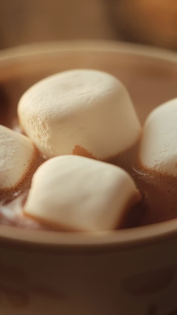 - Vertical video: Marshmallows melting into steaming hot cocoa in rustic mug