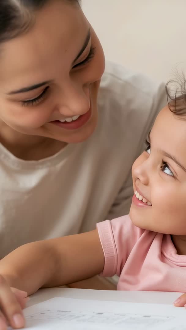AI Generated Video. Closeup vertical video showing mother guiding daughter through worksheet, smiling and making eye contact. Warm natural light creating soft, intimate mood. Focusing on facial expressions, hand gestures, and worksheet details, conveying trust and learning connection. Serving for promoting homeschooling, tutoring services, educational apps, parenting blogs, family lifestyle content, and social media vertical ads. Suggesting use for hero section of education websites, in-app onboarding screens, Instagram Reels, TikTok ads, and parenting articles. Replacing background with soft text overlay, adding friendly voiceover about learning together, or pairing with upbeat music to emphasize positive parent child bond.