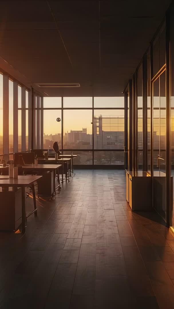 AI Generated Video. Footage showing empty modern office corridor during golden hour, sunlight shifting across hardwood floor and glass partitions. Camera moving slowly toward floor-to-ceiling windows, city skyline visible through panes and reflecting on surfaces. Mood creating calm, cinematic atmosphere for corporate storytelling, office tour, real estate marketing, company culture videos, recruitment ads. Useful as hero background for website headers, social media reels, mobile ads, broadcast bumpers, video transitions, or lower third backgrounds. Color grading and soft music enhancing warm sunset tone. Compatible with vertical formats like Instagram Stories, TikTok, Snapchat, and mobile-first campaigns.