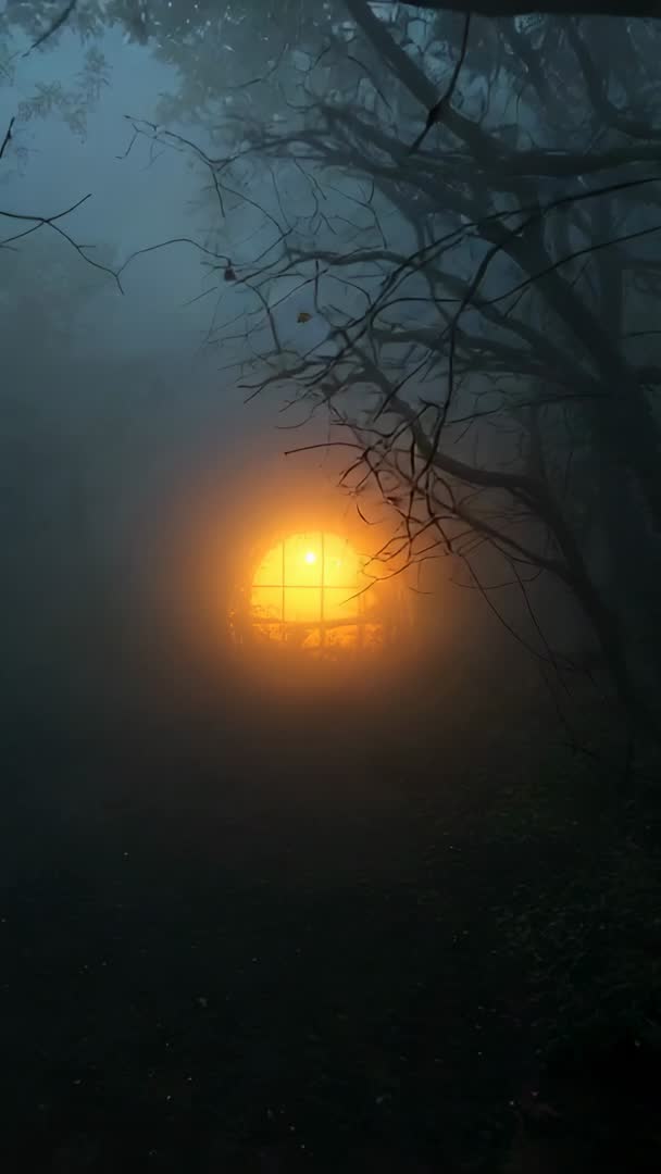 AI Generated Image. Vertical frame capturing moving camera pushing through dense mist along forest path. Warm amber light glowing behind grid window, creating strong focal point and soft halo through fog. Bare branches and tree silhouettes framing composition, adding moody, cinematic tension and sense of solitude. Visual mood evoking mystery, introspection, autumn or late-evening atmosphere. Use for film and video projects such as thriller or fantasy trailers, title sequences, atmospheric interludes, or social media vertical ads. Use as background for book covers, album art, meditation or sleep apps contrasting warm and cool tones, or landing pages promoting retreats and seasonal campaigns. Clip suiting mobile-first platforms and reels; recommend gentle color grading to enhance teal-orange contrast and subtle looping for ambient backgrounds. Delivery note: vertical orientation optimized for smartphone consumption.