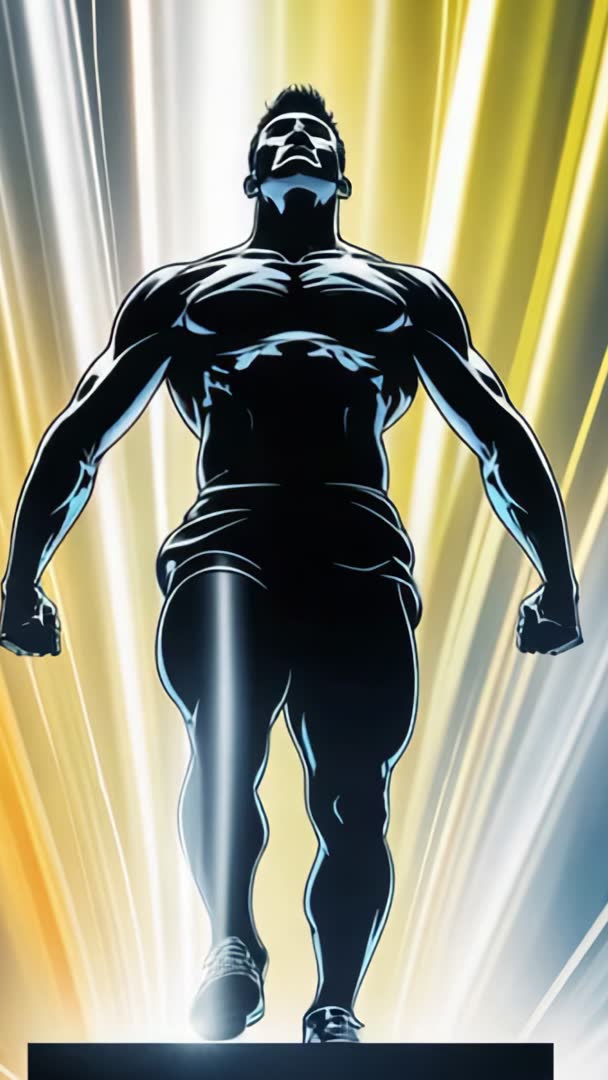 AI Generated Image. Vertical video showing muscular male stepping onto illuminated platform while beams of light activating behind him, posing triumphantly. High-contrast silhouette and dramatic backlight conveying strength, confidence, and heroic energy. Serving fitness campaign, motivational social clip, sportswear promo, superhero intro, product launch trailer, event opener. Using slow-motion and epic music for cinematic impact. Pairing with bold headline, strong typography, and brand colors for marketing and empowerment messaging. Delivering versatile footage for Instagram Reels, TikTok, YouTube Shorts, broadcast promos, and keynote visuals.