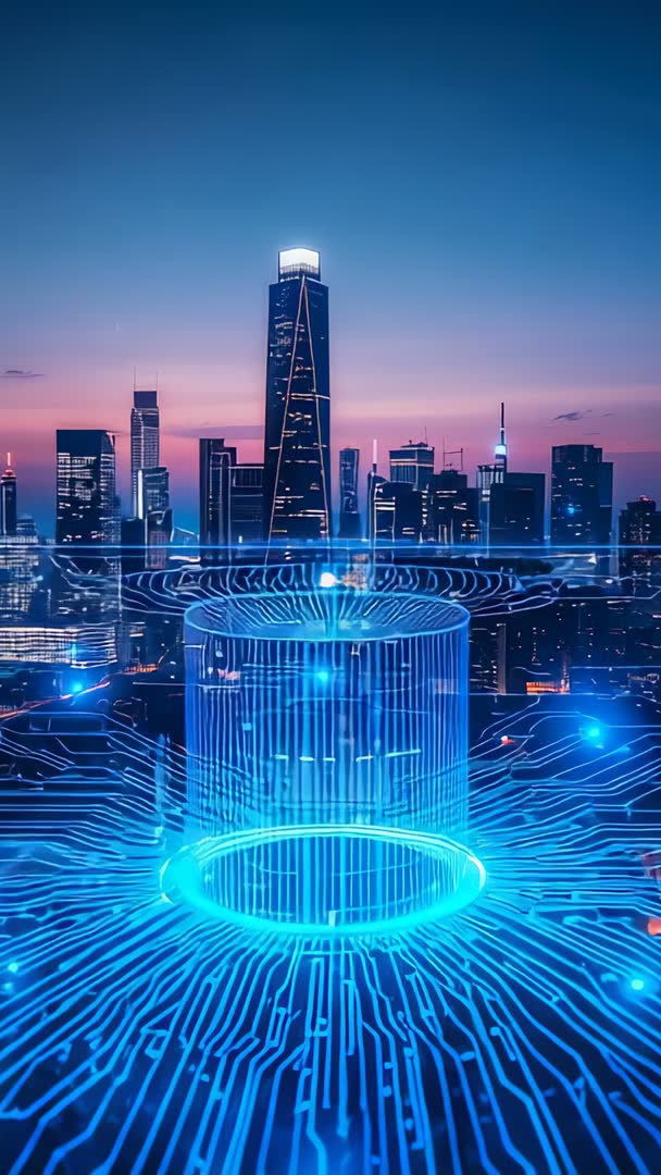 - Vertical video: Neon-blue holographic cylinder rising from grid powering futuristic skyline