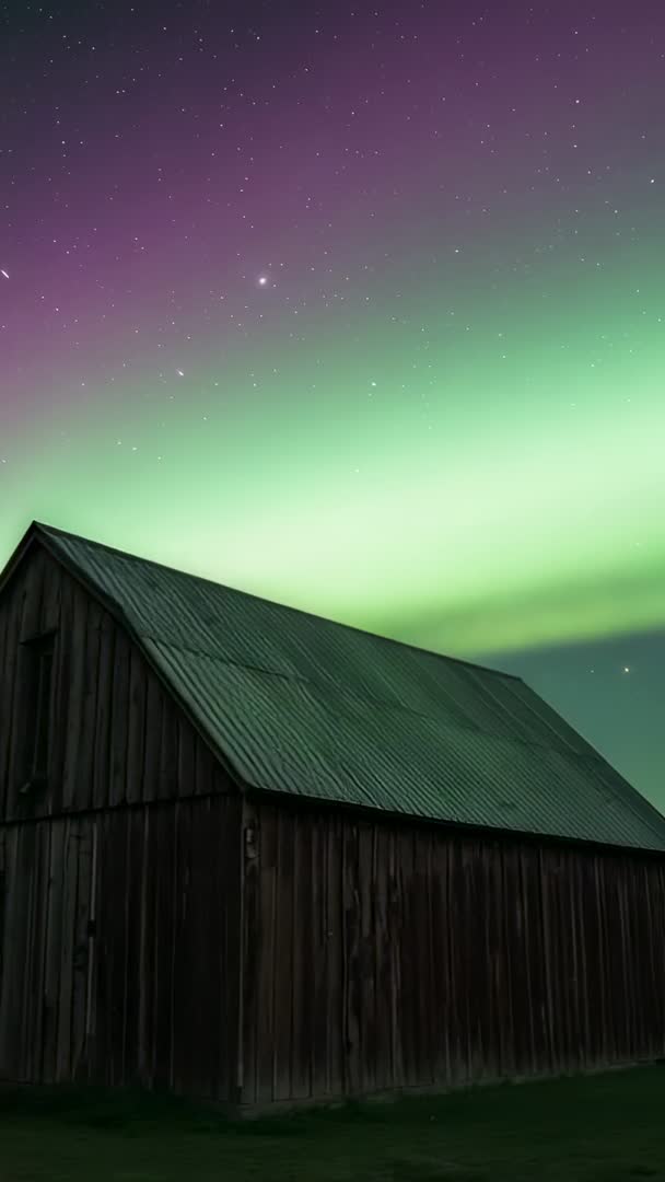 AI Generated Video. Vertical footage showing northern lights aurora dancing above weathered wooden barn under starry night sky. Green and purple light bands sweeping across horizon while stars punctuating deep sky, creating cinematic contrast with rustic roofline. Quiet rural landscape providing moody backdrop for travel promos, tourism campaigns, astronomy content, environmental storytelling, social media reels, and vertical video ads. Recommending slow pan or gentle push-in to emphasize aurora motion, adding ambient soundtrack or soft piano for atmosphere, and applying subtle noise reduction with color boost on greens and magentas. Ideal for mobile-first platforms, title cards, inspirational quote backgrounds, documentary openers, and website hero clips.