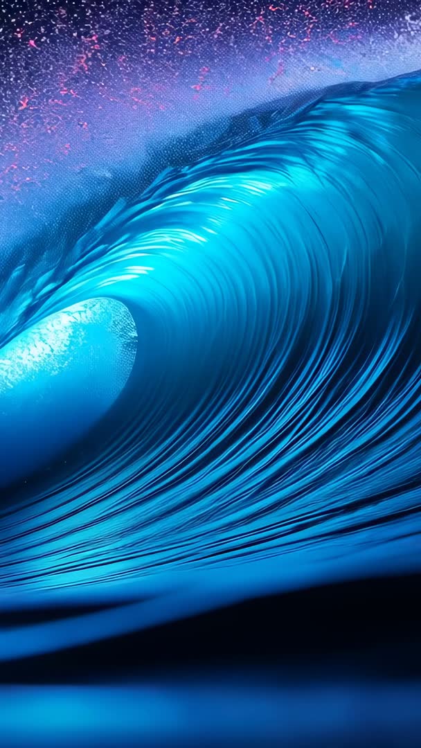 - Vertical video: Ocean swell curling into bioluminescent barrel with pink spray