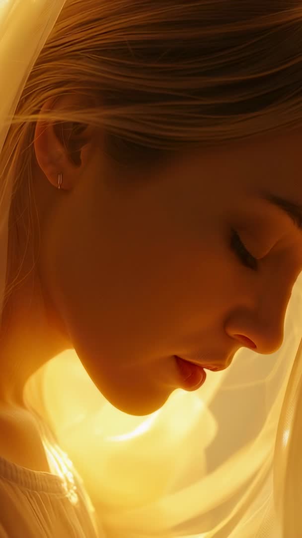 - Vertical video of backlit woman lowering gaze through sheer veil with warm amber glow