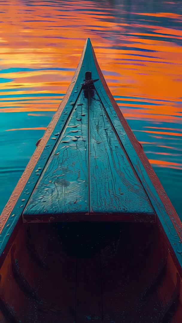 AI Generated Video. Vertical video showing boat bow gliding across calm lake at sunrise while sky painting water with orange and teal reflections. Close-up view of weathered wooden prow with grain detail and water droplets leading viewer toward distant horizon. Gentle ripples creating mirror-like patterns and bold color contrast for cinematic mood. Ideal for travel and adventure reels, wellness and meditation clips, mobile fullscreen backgrounds, social media vertical ads, website hero banners, and YouTube shorts. Visual space at top for overlay text or logo and steady forward motion suitable for seamless loop or slow motion edits.