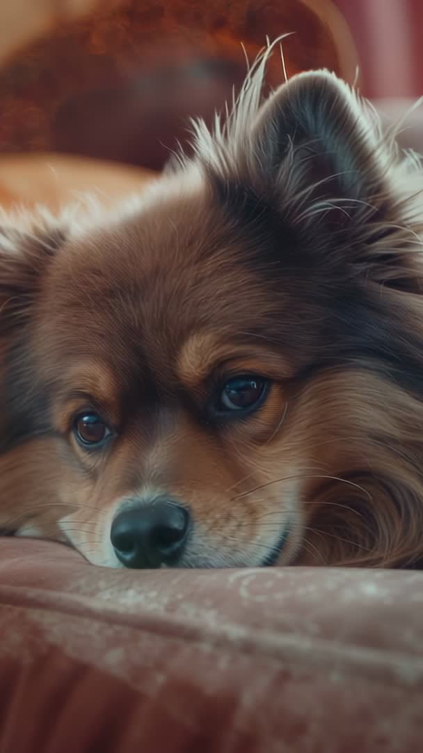 AI Generated Image. Closeup vertical video capturing brown fluffy dog blinking and shifting gaze while resting on sofa cushion. Warm indoor light highlighting plush fur and expressive eyes, gentle ear movement at start creating natural moment. Slow intimate pacing and shallow depth of field emphasizing emotion and texture. Ideal for social media reels, pet care or veterinary promos, adoption campaign clips, lifestyle blogs, greeting cards, website hero sections and video ad campaigns. Clip offering loop-friendly playback, vertical 9:16 aspect, suitable for mobile-first platforms and short-form content. Use with soft music or voiceover about companionship, pet wellness or cozy home life.