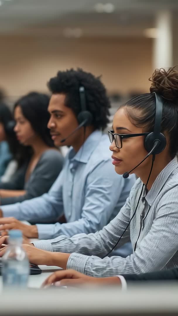 - Vertical video of call center agents wearing headsets handling calls and typing at desks
