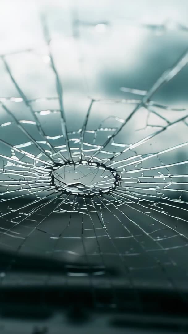 AI Generated Video. Close-up vertical footage showing circular impact point and radial spiderweb fracture spreading across windshield. Camera shifting slowly inside cabin, focusing on glass shards, fracture lines, and reflective highlights. Visual mood featuring cool teal tones with high contrast, creating dramatic and clinical tone. Serving well for insurance claim documentation, windshield repair service promotion, road safety campaign visuals, and news coverage of traffic incidents. Also serving well as hero clip for repair shop websites, social media reels, tutorial videos on stone chip repair, and cinematic insert in automotive dramas. File suitable for cropping to landscape or square, and for slow-motion playback to emphasize fracture details. Rights-cleared for commercial use in branding, training materials, editorial stories, and stock libraries.