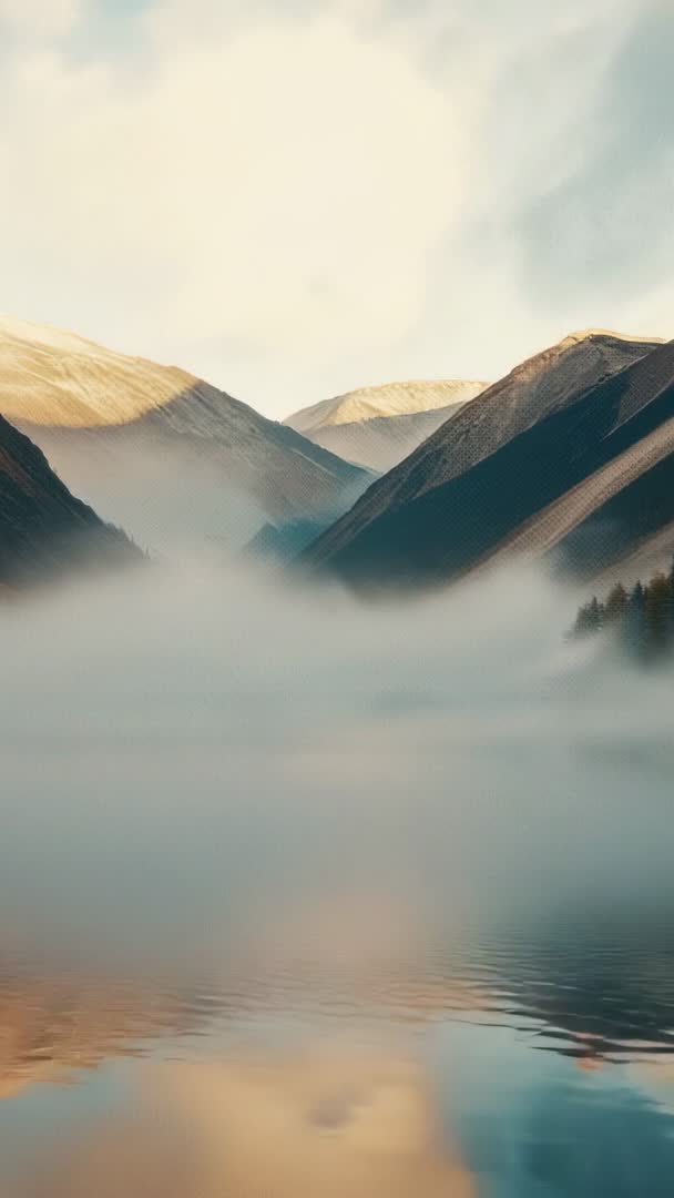 - Vertical video of dawn mist drifting through alpine valley reflecting sunlit ridges and conifers