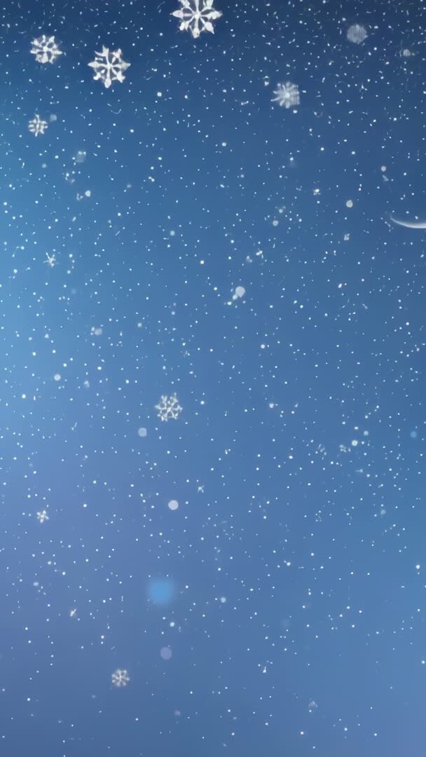 - Vertical video of delicate snowflakes drifting across blue night sky with crescent moon