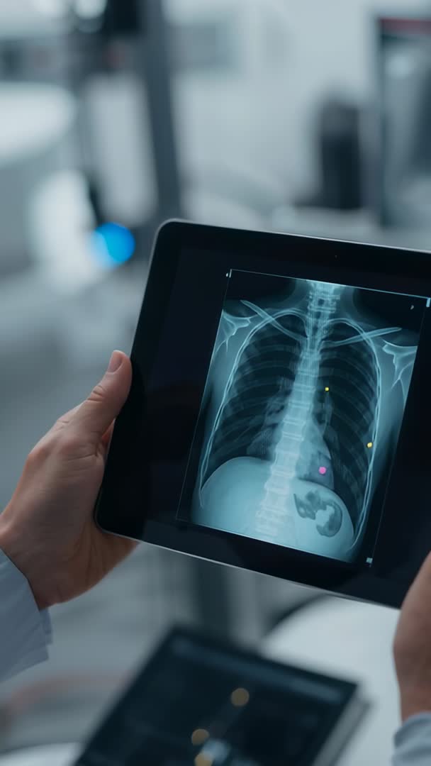 AI Generated Image. Showing doctor in white coat holding and tilting tablet while reviewing annotated chest X-ray (CXR) on vertical display. Close-up view of tablet screen highlighting lung fields, spine, and marker annotations for diagnostic discussion. Offering natural vertical composition optimized for mobile-first platforms and social media reels. Suitable for use in medical training, radiology software demonstrations, telemedicine promotions, hospital marketing, clinical workflow tutorials, and social media vertical ads. Pairing with voiceover explaining findings, overlay graphics for annotation, or clinical case studies. Useful for educational presentations, website hero video, app store preview, and pitch decks for medical startups.