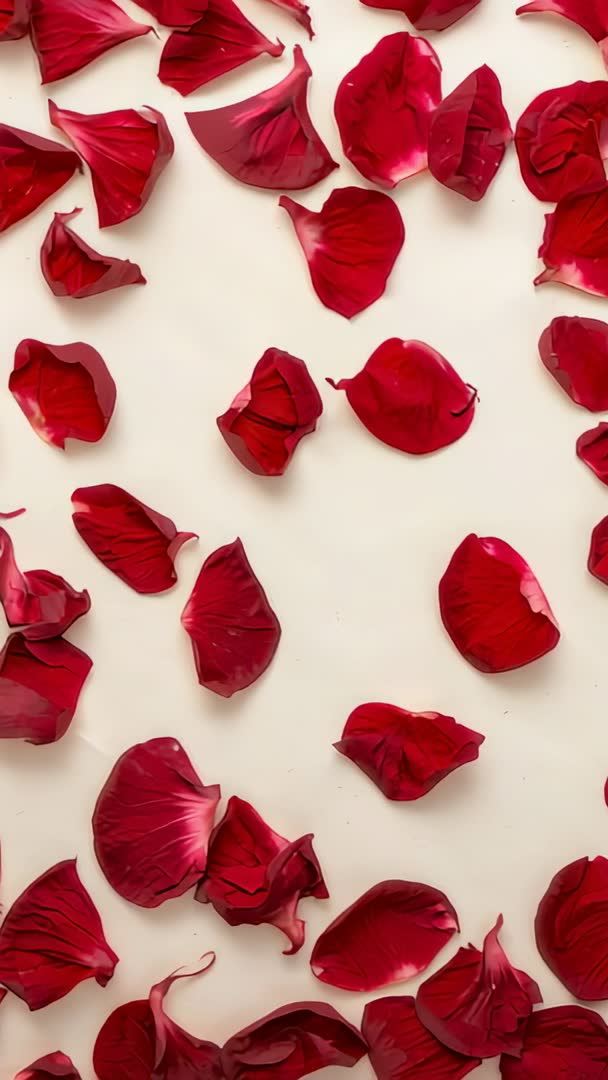 AI Generated Video. Video showing drifting deep red rose petals scattered across cream paper while soft highlights and subtle shadows accentuate velvety texture. Camera shifting slowly in vertical motion, creating gentle cinematic flow. Macro flatlay framing capturing rich crimson tones and delicate petal edges, loopable for repeating playback. Usage suggestions: Use for Valentine campaign, wedding promo, romantic social reels, beauty and perfume ads, greeting card animations, blog headers, product backgrounds, luxury branding, texture overlays, and presentation backdrops. Ideal for mobile-first platforms, Instagram and TikTok reels, vertical ad slots, and hero sections. Clip allowing color grading and cropping, suitable for seamless slow-motion edits and elegant transitions.