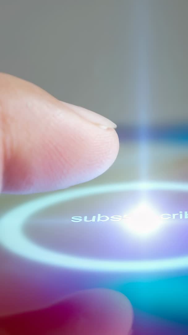 - Vertical video of fingertip tapping glowing subscribe button with ripple and light beam