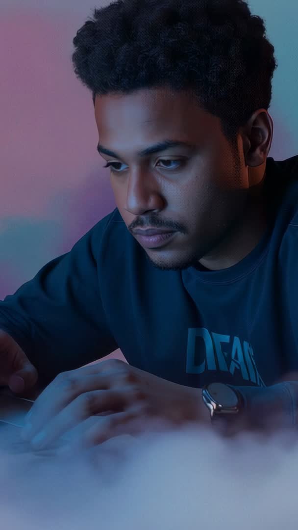 AI Generated Image. Vertical clip showcasing man leaning forward and tapping laptop keys under pink and blue LED haze. Close-up framing highlighting facial concentration and hand movement, creating moody tech atmosphere. Wearable smartwatch and casual sweatshirt adding modern lifestyle detail. Ideal for use in app promo, startup landing page, social media vertical ads, online course trailers, productivity blog headers, and technology editorial content. Suitable for background in mobile-first campaigns, still frames for thumbnail creation, or overlaying text for tutorial intros. Color palette supporting neon, cyberpunk, and creative industry themes.