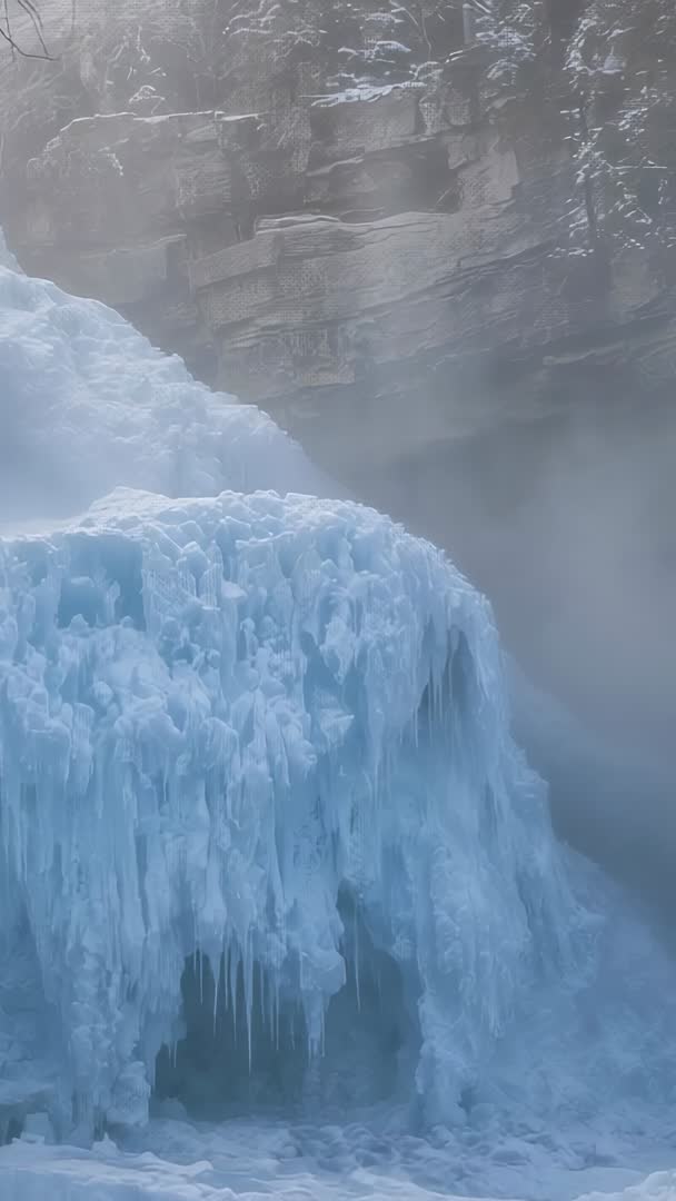 AI Generated Video. Vertical video showing frozen waterfall emitting mist from base and forming long cascading icicles along narrow cliff face. Scene featuring blue-white ice formations, layered rock face, and drifting fog creating moody, cinematic atmosphere. Footage suiting mobile-first platforms such as Instagram Stories, TikTok, Snapchat and vertical website hero sections. Use as b-roll for travel and nature documentaries, climate change features illustrating freezing processes, winter tourism promotion, or seasonal marketing campaigns. Clip working well for slow-motion playback, looped background, and subtle speed ramping; gentle color grading enhancing cool blue tones and texture detail. Creative uses include background for title cards, social media ads, atmospheric interstitials, desktop wallpapers, and editorial spreads focused on outdoor adventure and winter landscapes.