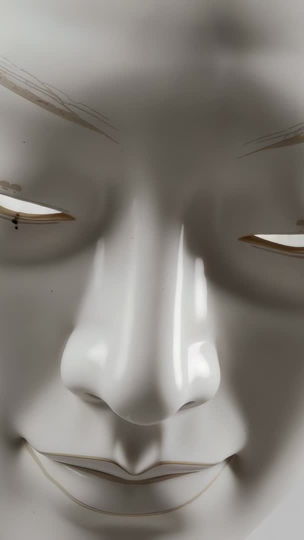 AI Generated Video. Vertical video showing glossy porcelain mask in tight close-up while camera slowly shifting to reveal deep shadow and small black bead near eye. Lighting creating dramatic highlights on glazed surface, emphasizing smooth nose, curved lips, and subtle skin-like texture. Clip working well for art and design promos, gallery teasers, title sequences, social media reels, and mood-driven commercial intros. Use with ambient or minimal soundtrack, slow motion, or subtle text overlays to maintain contemplative atmosphere. Technical notes: vertical 9:16 orientation, short looping potential, neutral color grading, slow pace recommended to preserve sculptural detail and calm tone.